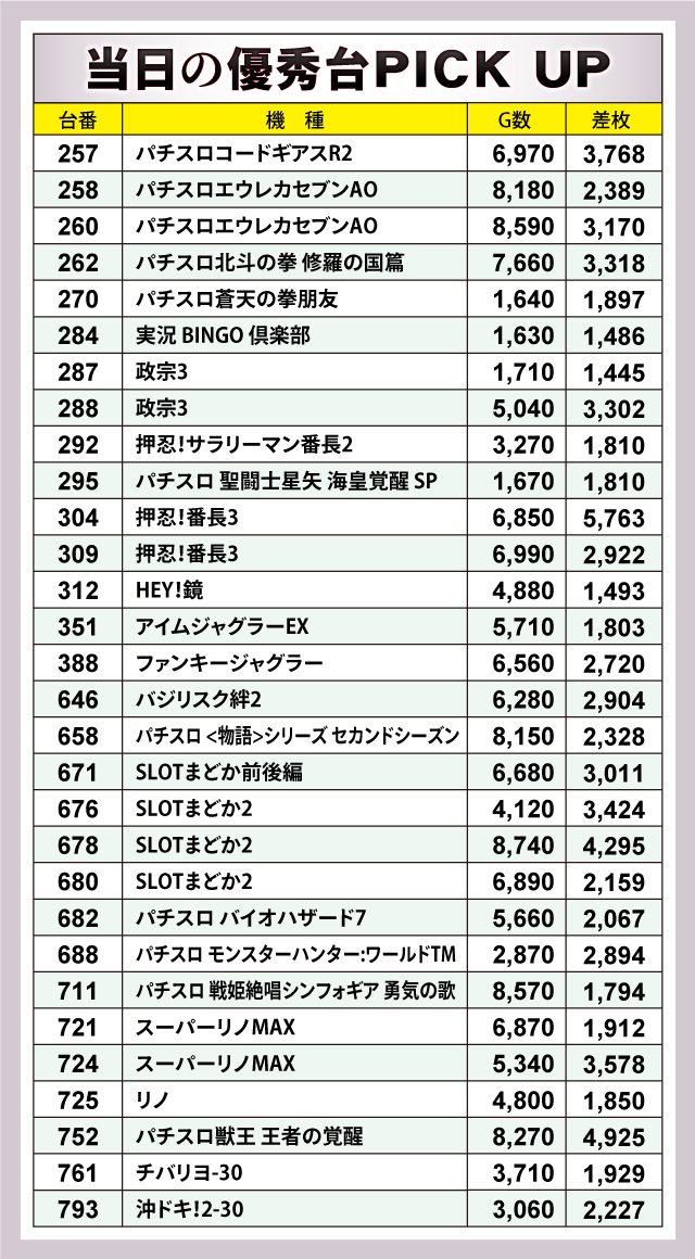 優秀台をチェックすると、+5,763枚を記録した『押忍!番長3』の304番台を筆頭に、+4,925枚の『パチスロ獣王 王者の覚醒』752番台、+4,295枚の『SLOT魔法少女まどか☆マギカ2』678番台、+3,768枚の『パチスロコードギアス反逆のルルーシュR2』257番台、+3,578枚の『スーパーリノMAX』724番台、+3,318枚の『パチスロ北斗の拳 修羅の国篇』262番台などが盛り上がりを見せていた。