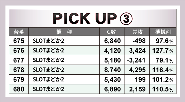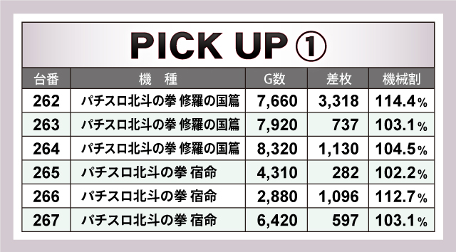 ピックアップ機種では、『パチスロ北斗の拳 修羅の国篇』、『パチスロ北斗の拳 宿命』、『政宗3』、『押忍!サラリーマン番長2』、『SLOT魔法少女まどか☆マギカ2』、『ツインドラゴンハナハナ-30』などが名を連ねていた。
