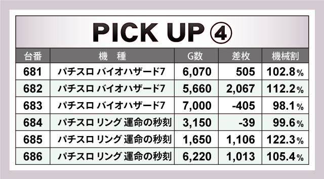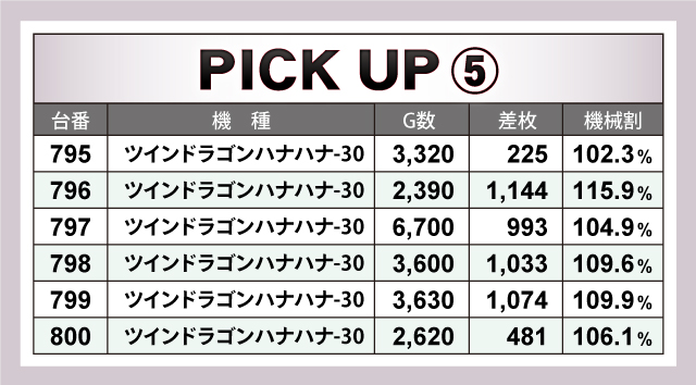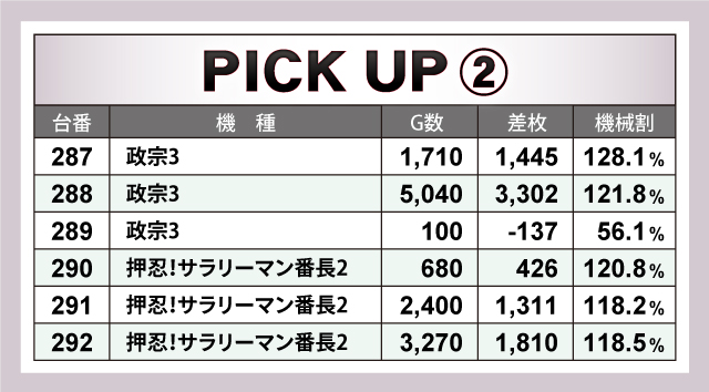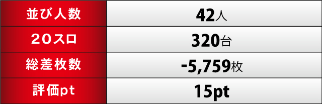 パチスロ全体では、ピックアップ機種の頑張りはあったものの、トータルの差枚数はマイナスに甘んじた。それでも、評価ptは15ptを獲得。次につながる結果を残したのであった。