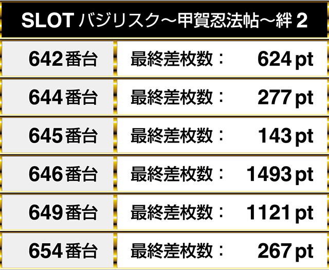 1日を通したデータをみると、6台中4台がプラスpt。2台が1000ptを上回り、3000ptオーバーの台もあった。