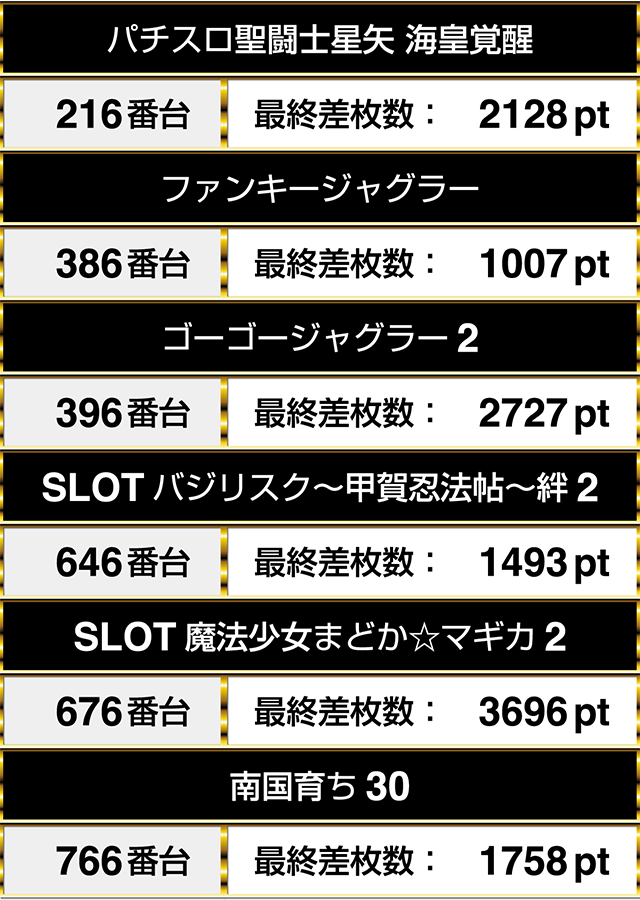 『パチスロ聖闘士星矢 海皇覚醒』の216番台と『ゴーゴージャグラー2』の396番台が2000ptオーバー!