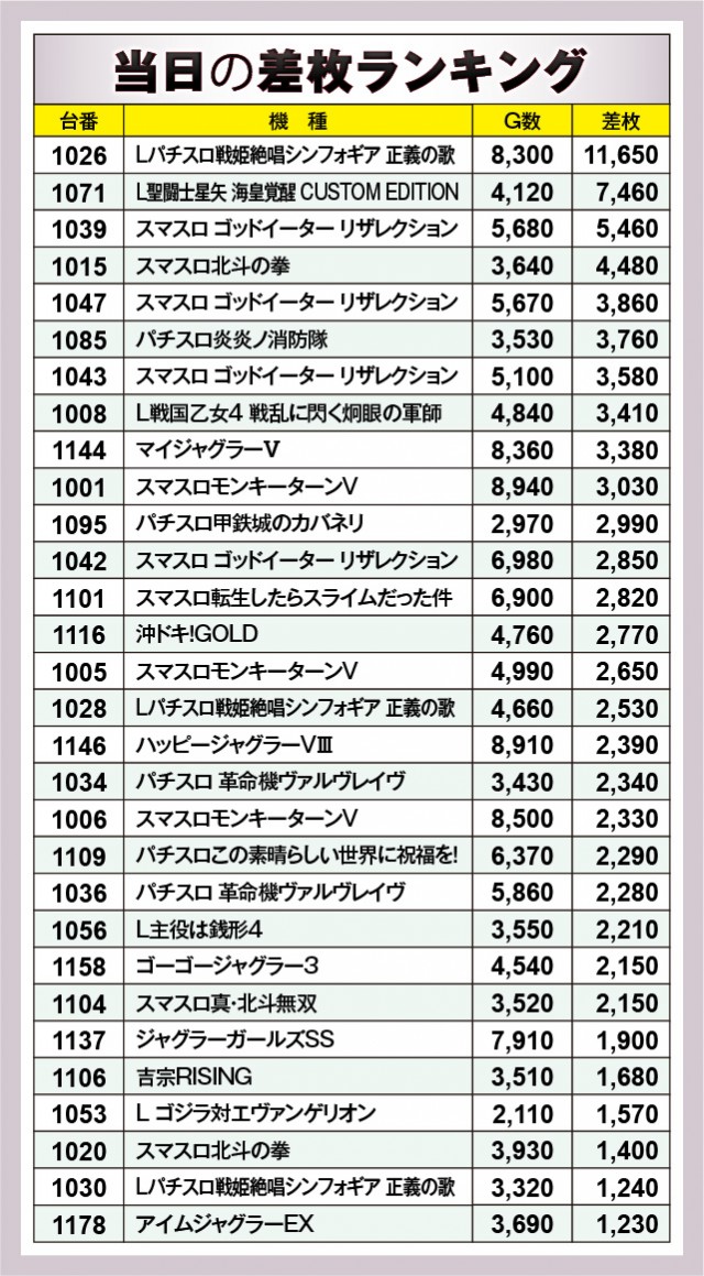 上表のポテンシャルを秘めた台は大きなマイナスが少なくなっている点から、店内の盛り上がりをリードする存在となっていたようだ。『スマスロモンキーターンV』『パチスロ 革命機ヴァルヴレイヴ』『スマスロ ゴッドイーター リザレクション』はまとまった出玉を獲得する台が多々見られ、その中でも『Lパチスロ戦姫絶唱シンフォギア 正義の歌』の万枚OVERは、ひと際目立った存在だったと言えるだろう。