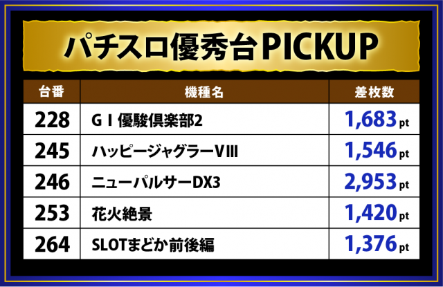 この日「低王」に上り詰めたのは『ニューパルサーDX3』246番台。+3千達成間近となるポイント数を成し遂げた。