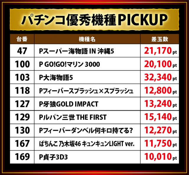続いてはパチンコで5桁のプラスを計上した9台をピックアップ。