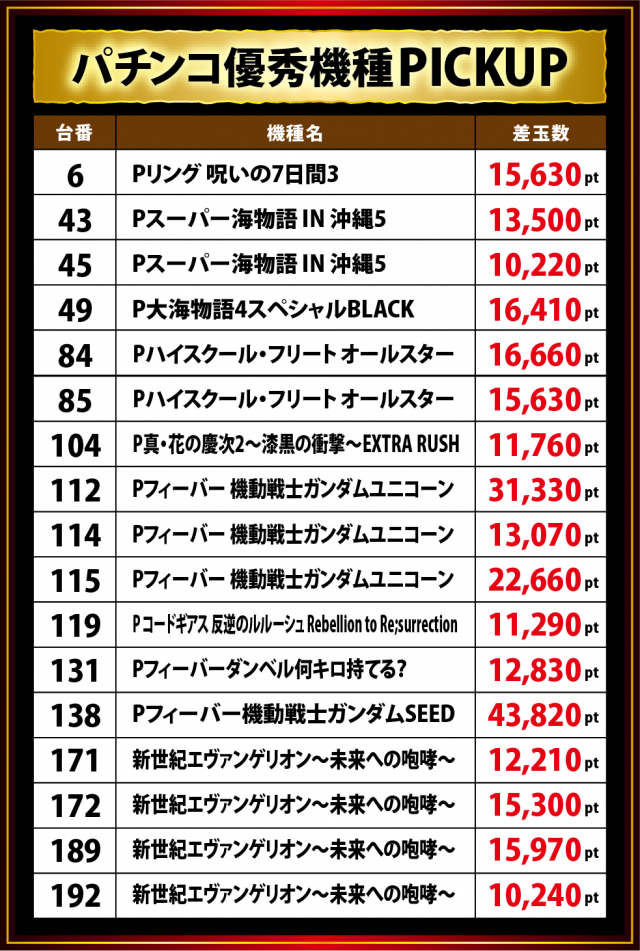 上記以外でもミドルからライトミドルまで、新旧とりあわせた様々な機種ラインナップが好出玉を連発。4パチ運営のホールにも負けないスコアを果たした。