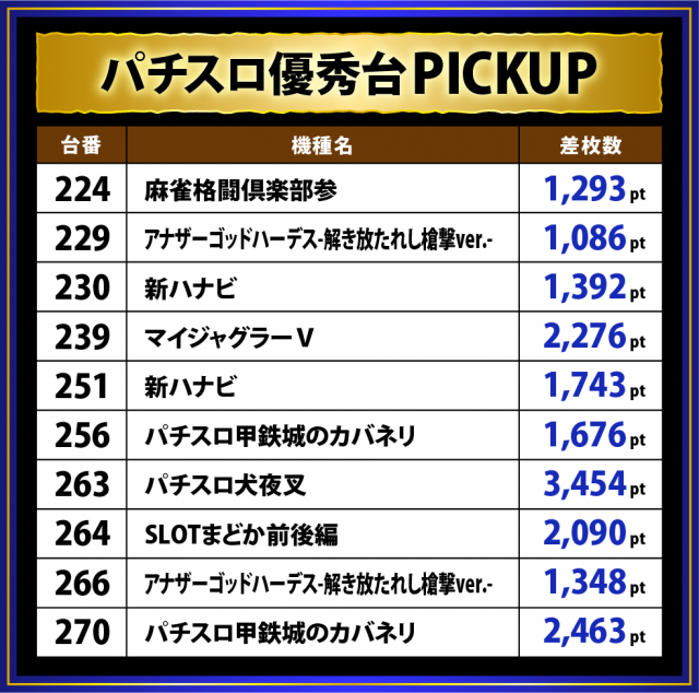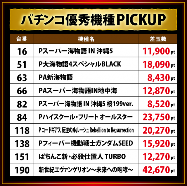 以下ではこの日のパチスロ・パチンコ各々の出玉データをチェックし、両ジャンルで「低王」の席に就いた台を始めに、優秀台の数々をピックアップしていこう。