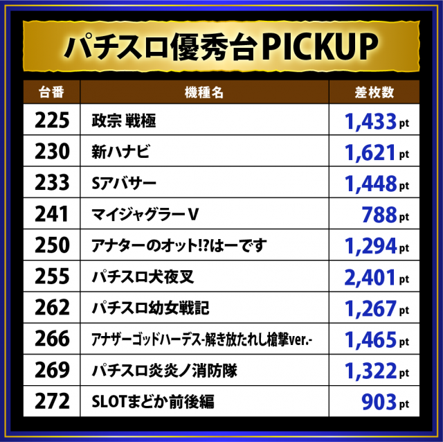 低王以下では『新ハナビ』『アナザーゴッドハーデス-解き放たれし槍撃ver.-』『Sアバサー』『政宗 戦極』が続いたが、前回の数値と比べると少し物足りなさを覚える数値となった。