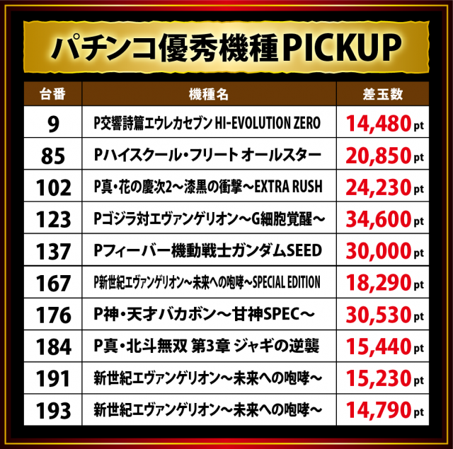 中でも「低王」の座に就いたのが『Pゴジラ対エヴァンゲリオン〜G細胞覚醒〜』123番台となり、+3万5千に迫る好差玉。また甘デジスペックながら『P神・天才バカボン〜甘神SPEC〜』が、そして人気のミドルスペック『Pフィーバー機動戦士ガンダムSEED』も+3万に達するスコアを残した。
