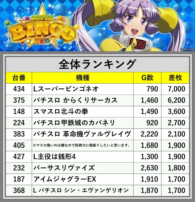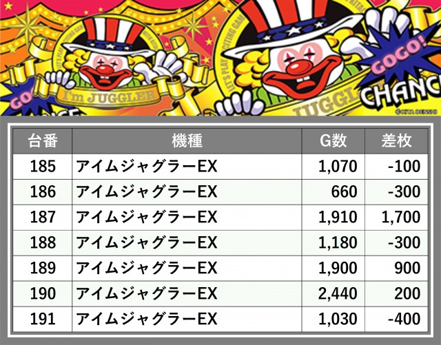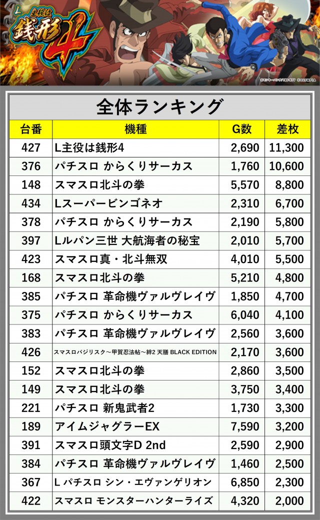 厳選された取材対象機種をはじめ、その他スロット全体から好記録が飛び出した!プレイヤーが楽しんだ1日を下記データにて振り返ってみて欲しい。