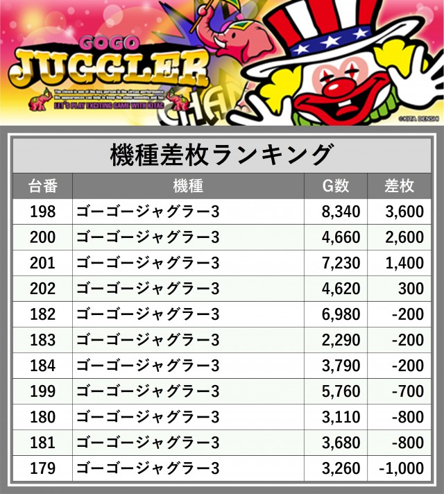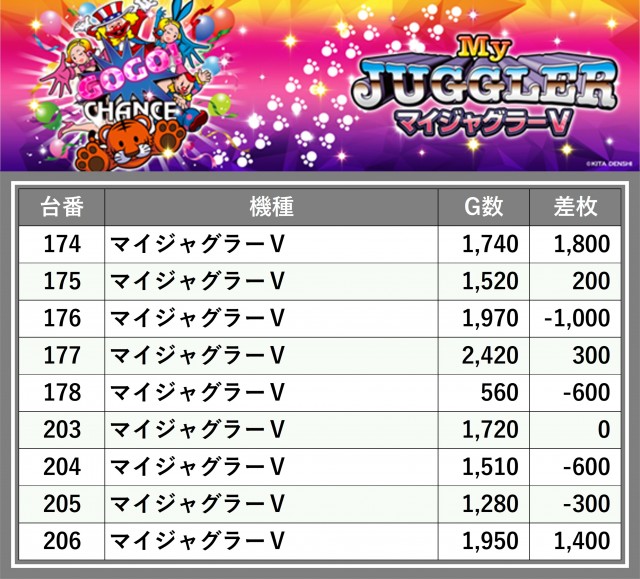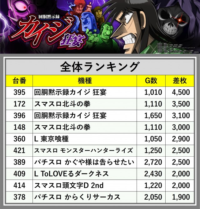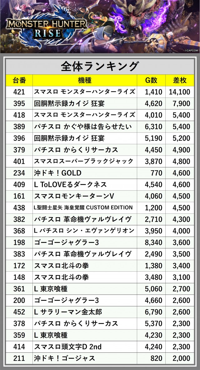 厳選された取材対象機種をはじめ、その他スロット全体から好記録が飛び出した!プレイヤーが楽しんだ1日を下記データにて振り返ってみて欲しい。