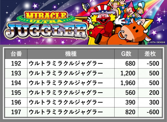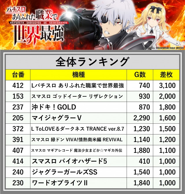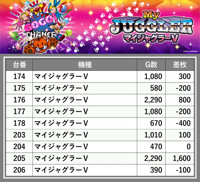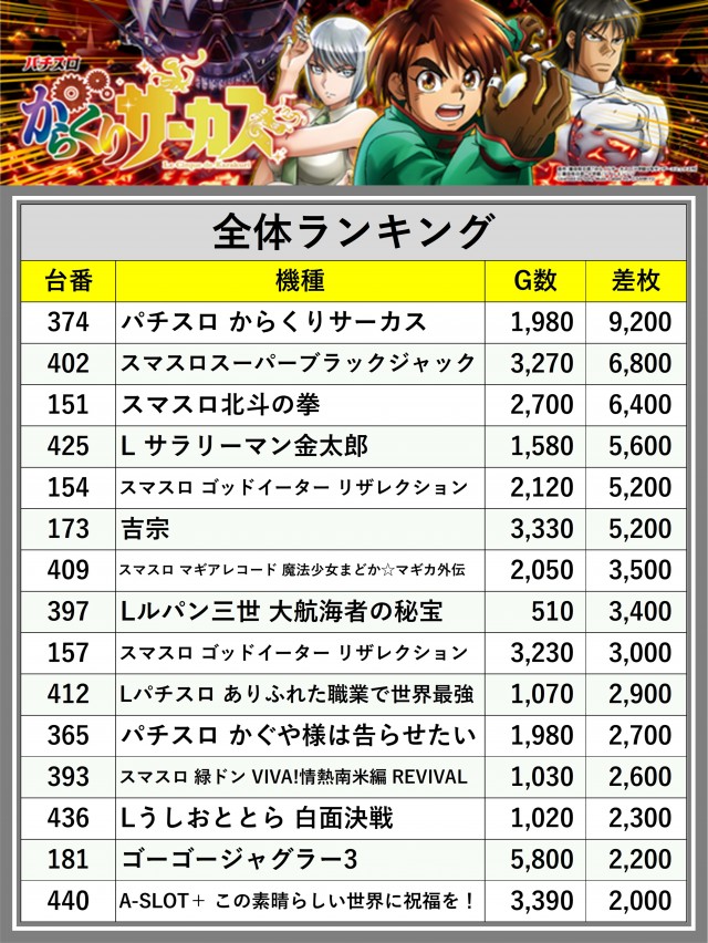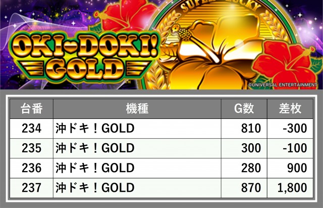 厳選された取材対象機種をはじめ、その他スロット全体から好記録が飛び出した!プレイヤーが楽しんだ1日を下記データにて振り返ってみて欲しい。