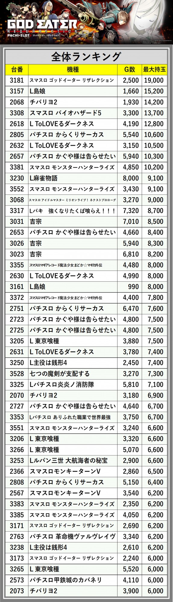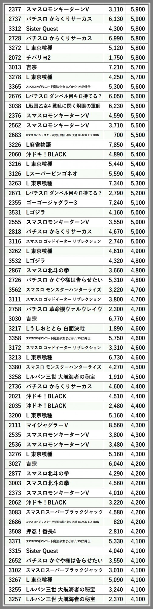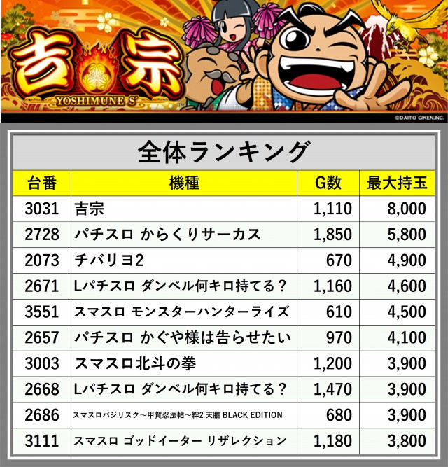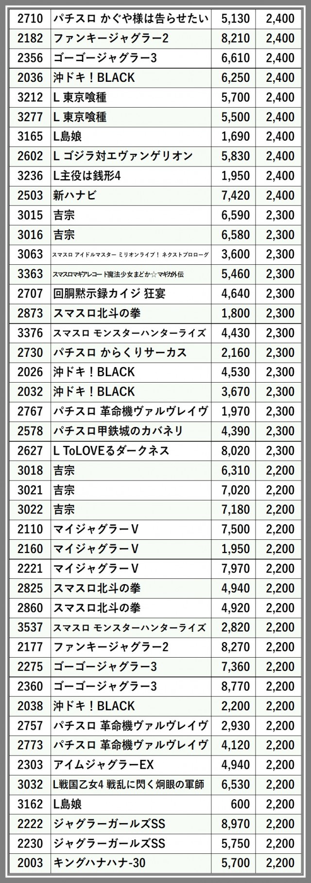 厳選された取材対象機種をはじめ、その他スロット全体から好記録が飛び出した!プレイヤーが楽しんだ1日を下記データにて振り返ってみて欲しい。