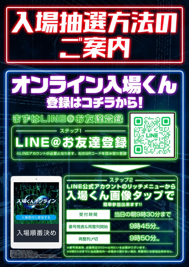 オンライン抽選。当日9時30分までに登録!9時45分番号発表! |