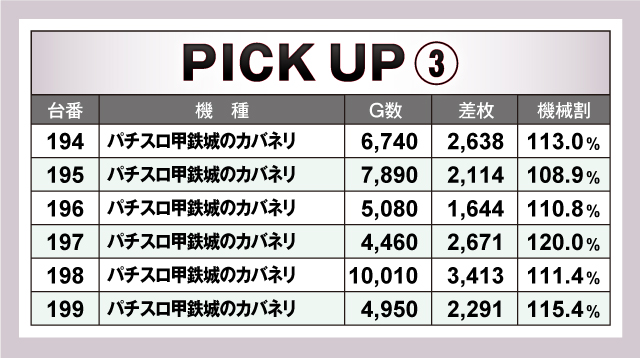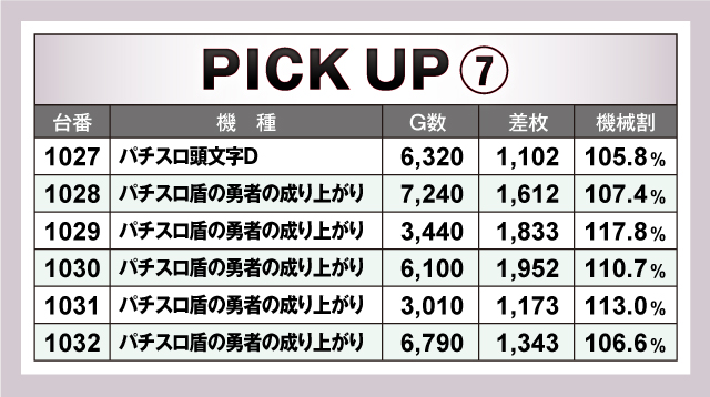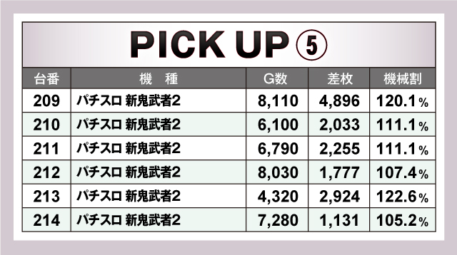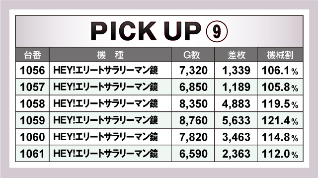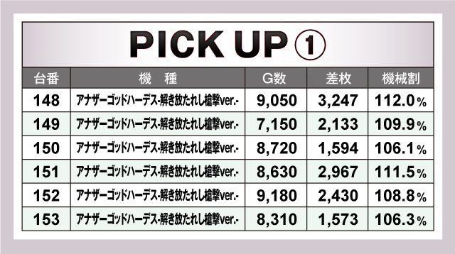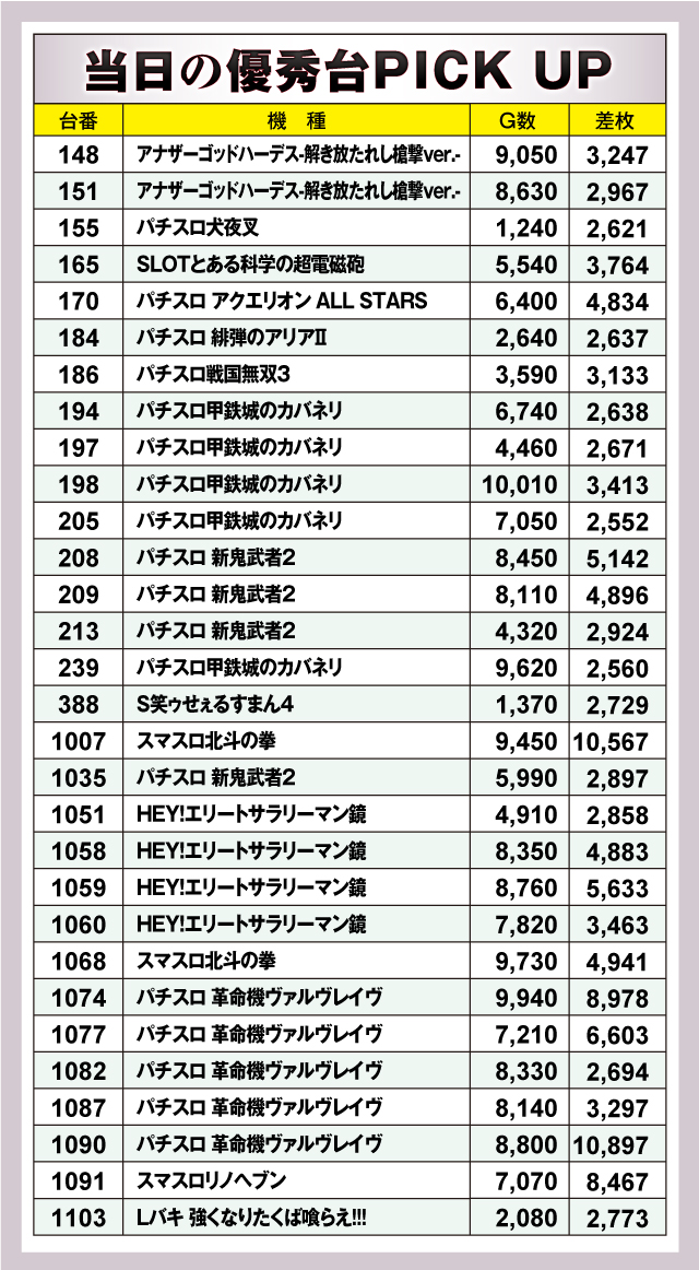 続いては、当日6台並びで好結果を残した11箇所66台を見ていこう。「アナザーゴッドハーデス-解き放たれし槍撃ver.-」「パチスロ甲鉄城のカバネリ」「パチスロ 新鬼武者2」「HEY!エリートサラリーマン鏡」「パチスロ 革命機ヴァルヴレイヴ」など、数えきれないほどの機種が活躍し、11箇所66台全てがプラス終了! この日、遊技していたファンたちが羨ましいとしか言えない結果を残した。これらの数値を見れば、当日の盛り上がり具合が分かってもらえるだろう。