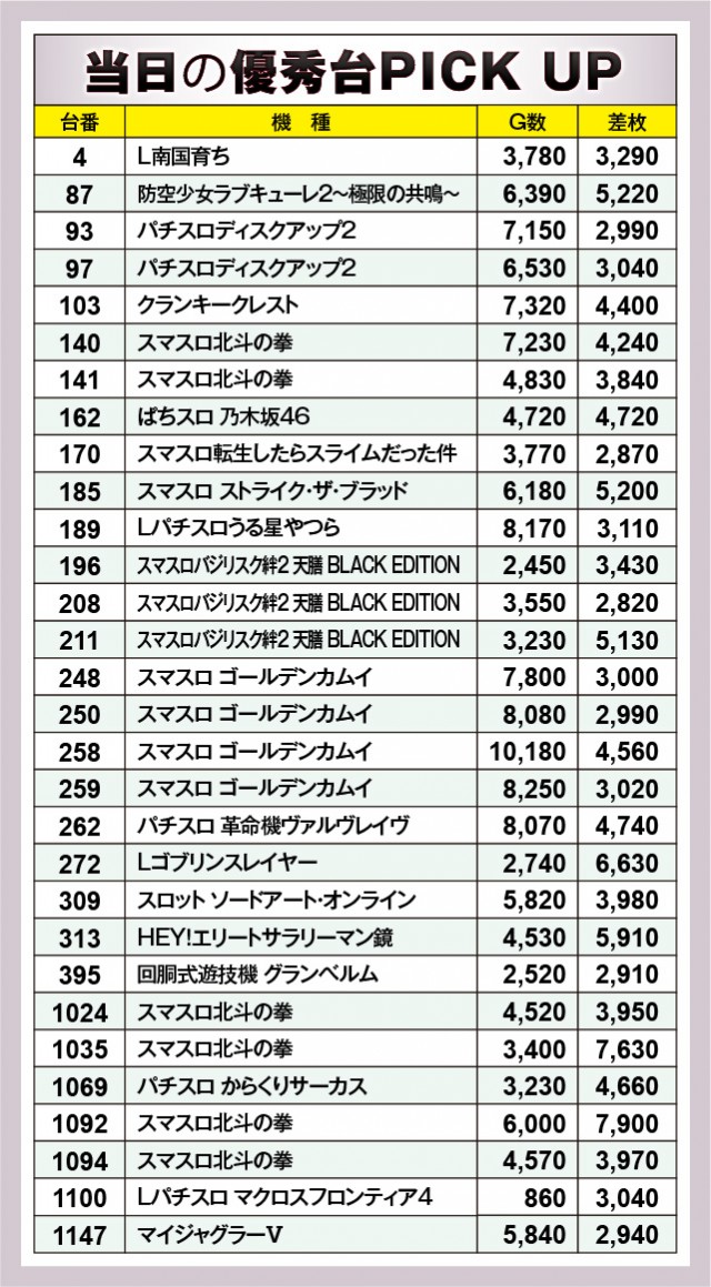 優秀台をチェックしてみると、『スマスロ ゴールデンカムイ』から万回転OVERが発生。ほかにも閉店までじっくりと打ち込まれた機種が多く、店内の状況は高い活気に満ちていたと言えよう。熱量に関しても『スマスロ北斗の拳』1092番台+7,900枚といった数字も確認でき、高い熱気で盛り上がっていたとも言える。