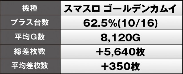 『スマスロ ゴールデンカムイ』は平均G数8,120Gとなっており、朝から閉店までじっくりと打ち込まれていたのが分かる。勝率6割という数字も申し分なく、しっかりと総差枚数プラスで結果を残したのが鮮烈であるばかりだ。遊技していたファンも手ごたえを感じていたはずで、今後の活躍も注目すべきだと言えよう。