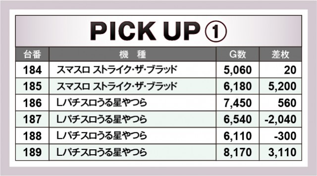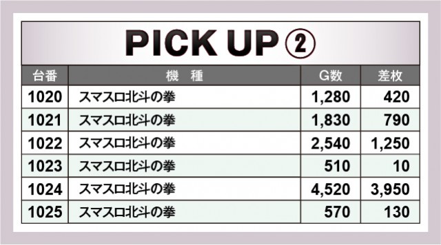『スマスロ ストライク・ザ・ブラッド』185番台+5,200枚と、大台突破台が発生していたのが目に焼きつく。184~189番台のエリアは高い活気を維持しており、1日を通して盛り上がったエリアと言えよう。『スマスロ北斗の拳』も1020~1025番台の6台が全台プラス差枚を達成しており、人気機種として存在感を放っていた。