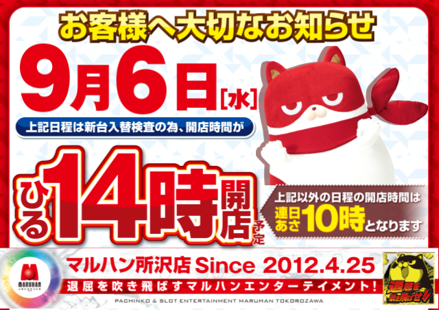 9月6日(水)新台入替検査の為 14時オープン!!