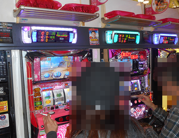 低貸し玉コーナーも朝イチと同じく、多くのプレイヤーが遊技をしていた。とくに、1円パチンコの「CRAスーパー海物語IN沖縄3」など海物語シリーズの遊パチは人気となっており、ほぼ満席状態。