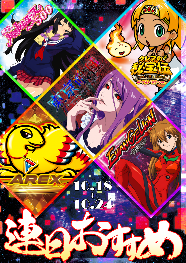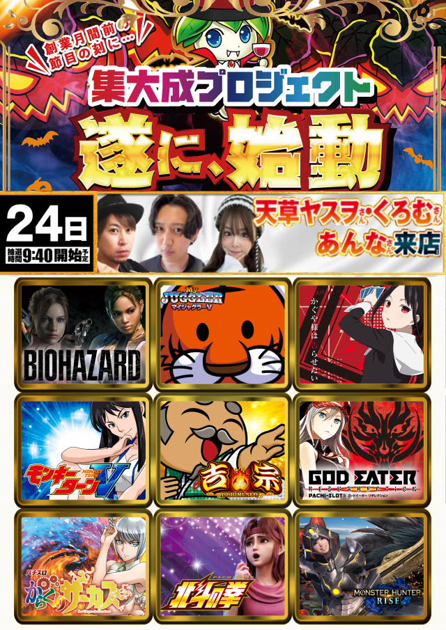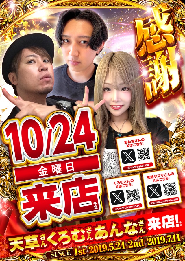 2025/10/23🎊感謝🎊10月24日10時開店!トリプル来店予定!🎊感謝🎊さいたま市岩槻区 感謝 10月24日(金) 10時開店予定 トリプル来店予定 天草ヤスヲさん くろむさん あんなさん  設置機種ポスター  連日オススメ機種   入場方法
