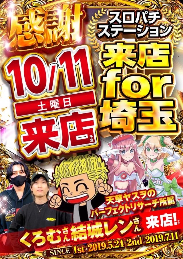 2025/10/10🎊感謝🎊10月11日スロパチ来店for埼玉!10時開店予定!春日部市  感謝 10月11日(土) 10時開店予定 天草ヤスヲの パーフェクトリサーチ所属 くろむさん 結城レンさん ダブル来店予定‼  連日オススメ機種 東京喰種 からくりサーカス  マイジャグラーV ネオアイムジャグラー  最新台機種  入場方法