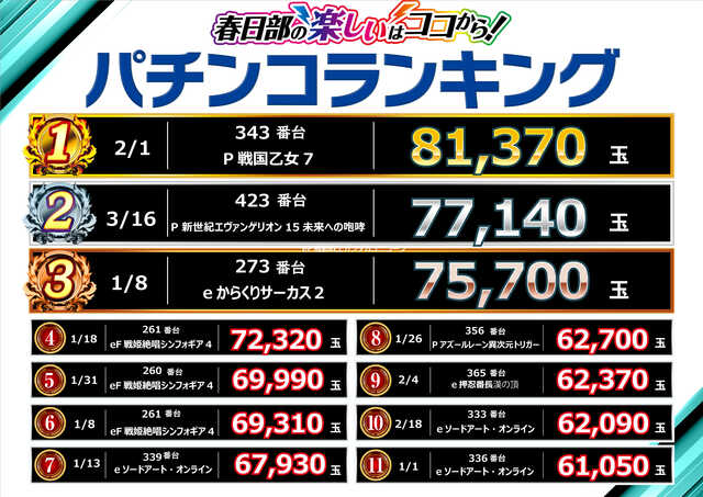 4パチ:265台 1パチ:155台 0.4パチ:20台 |