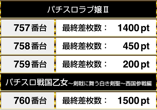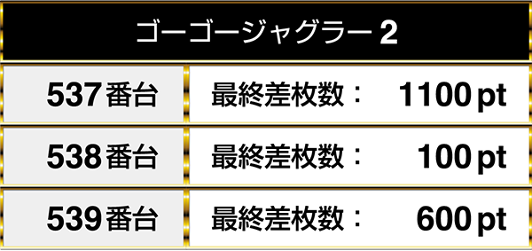 どちらの機種も3台が連なってプラスptとなり、1000ptを上回る台もあった。