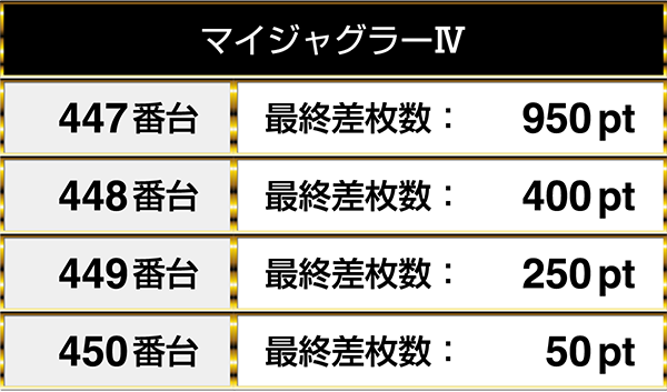 1日を通したデータでは、447番台から450番台までの4台が並んでプラスptを記録した。