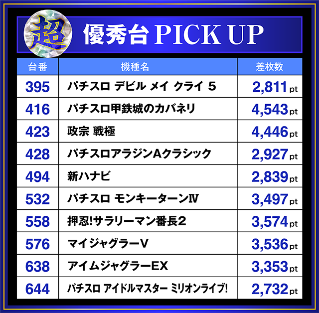 +4,000pt以上を記録した台を、「政宗 戦極」や「パチスロ甲鉄城のカバネリ」といった新台にて確認。