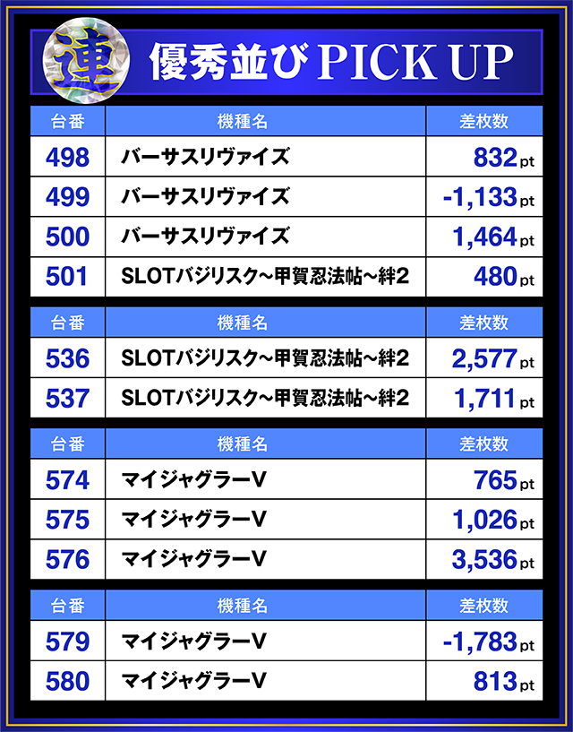 「SLOTバジリスク~甲賀忍法帖~絆2」や「マイジャグラーV」に、2台、3台とプラスが続き、+2,500ptオーバーもアリ。