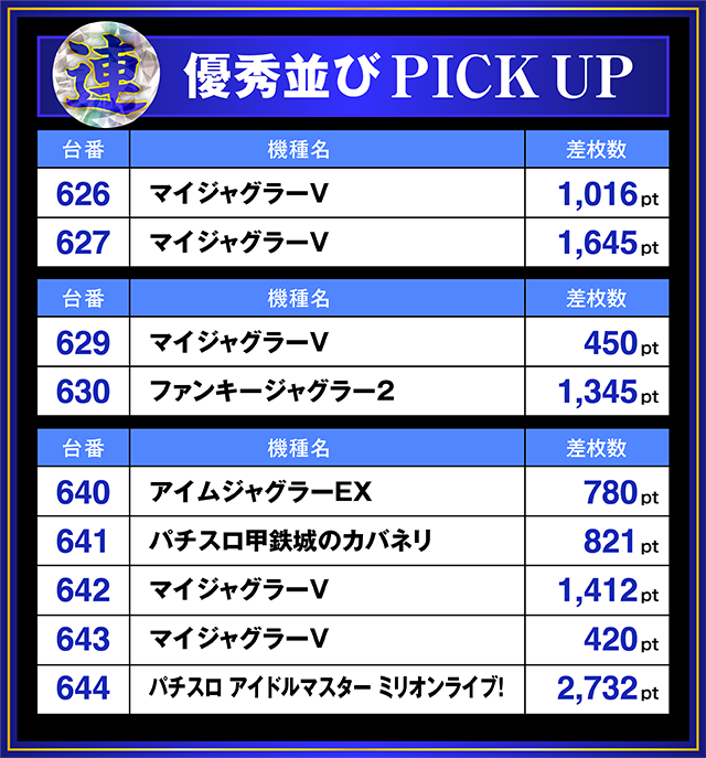 「アイムジャグラーEX」の640番台から「パチスロ アイドルマスター ミリオンライブ!」の644番台までは、5台が連続してプラスとなった。