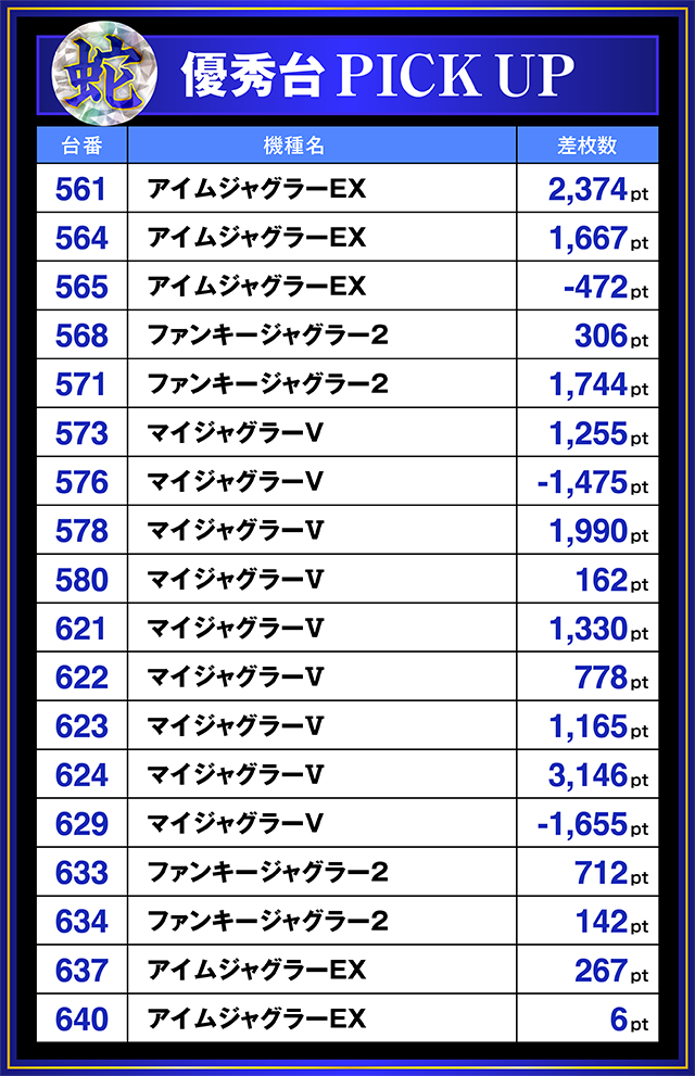 各機種でひときわ目をひかれたのは、「マイジャグラーV」の578番台と624番台、「アイムジャグラーEX」の561番台と637番台、「ファンキージャグラー2」の571番台。これらの台の多くはボーナス回数が60回を超えた。