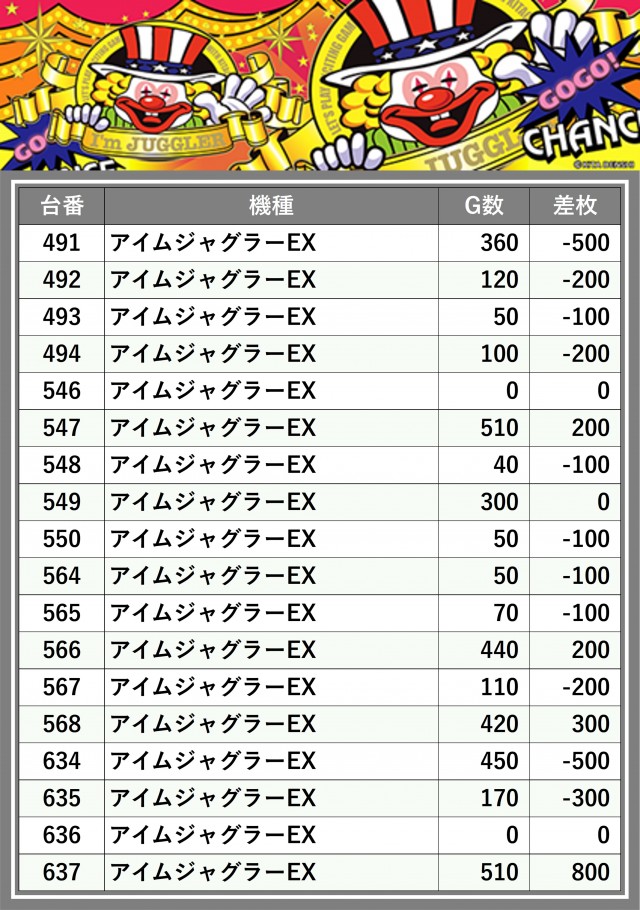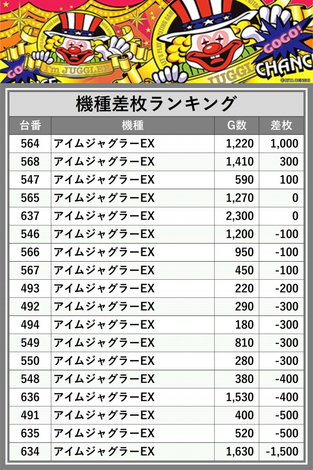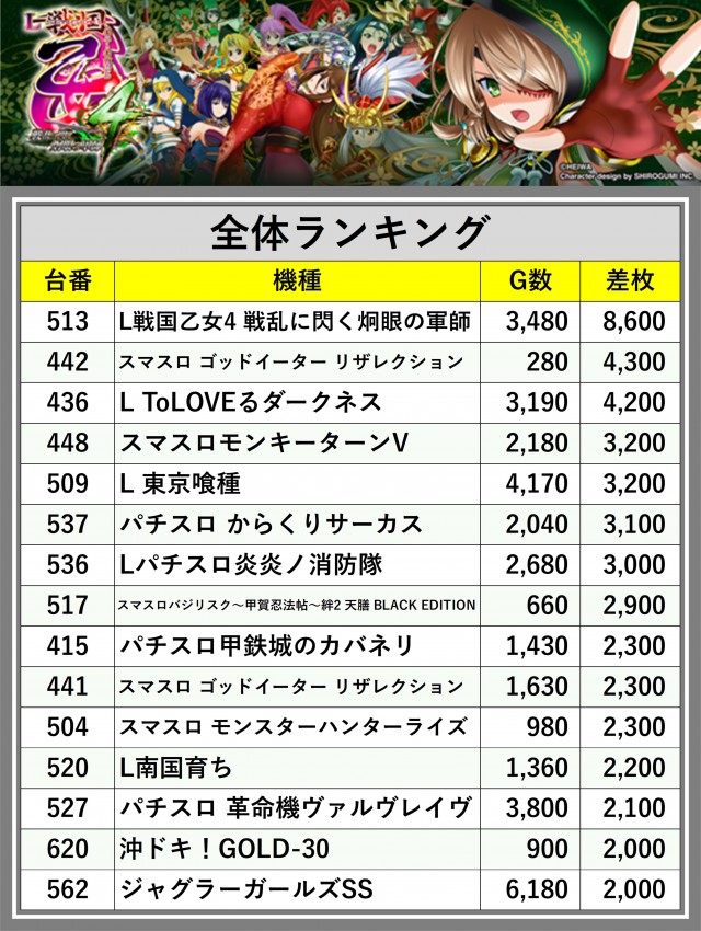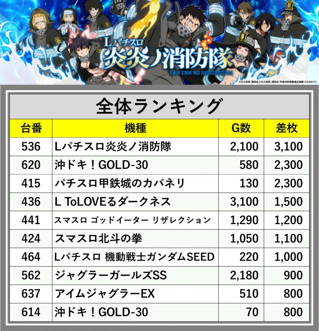 ※差枚数順に掲載しています