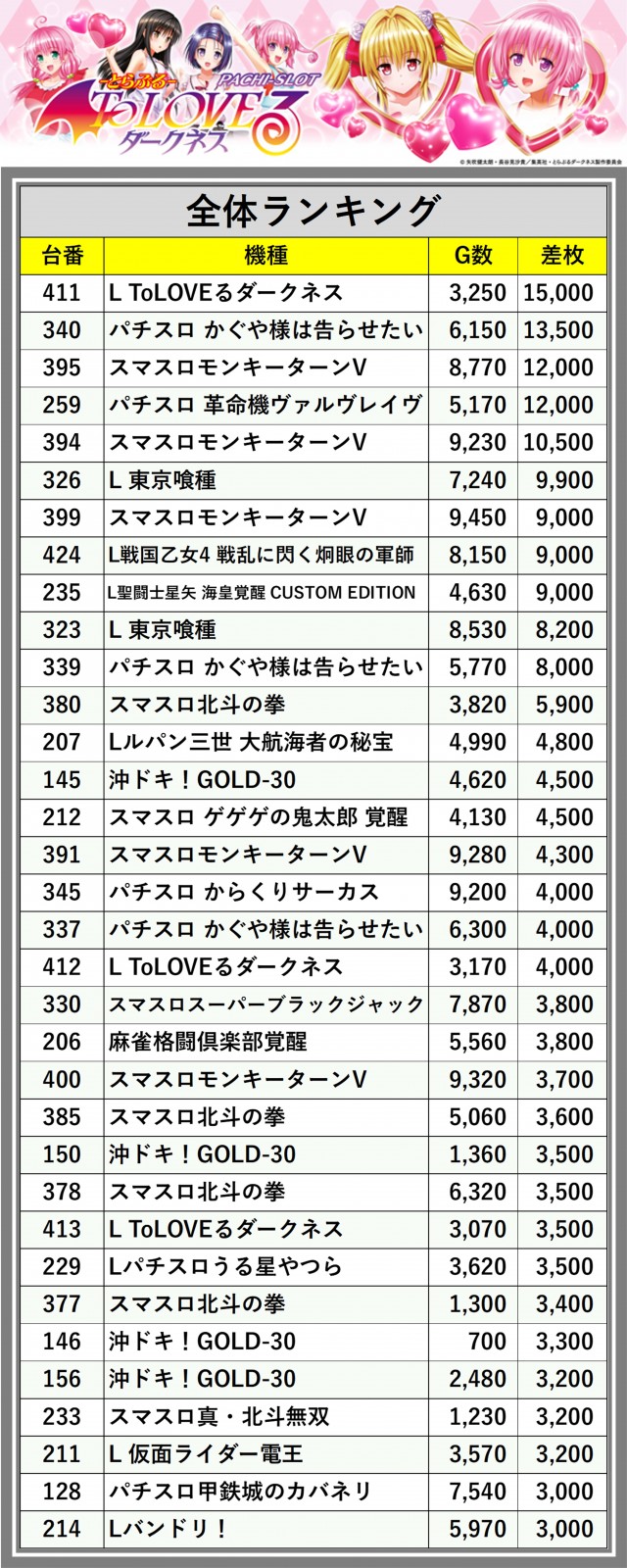 ※差枚数順に掲載しています