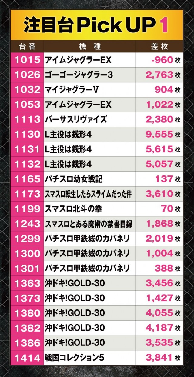 そのほか『沖ドキ!GOLD-30』は全台1,000枚オーバー、さらにジャグラーシリーズからも多数好調台が出現するなど満足度の高い内容だった!次回のブラックエンジェルス降臨の際も、是非この結果を参考にしてほしい。