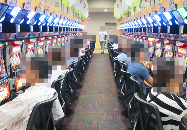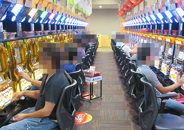 5円パチスロも、空席が少ないほどに盛況。