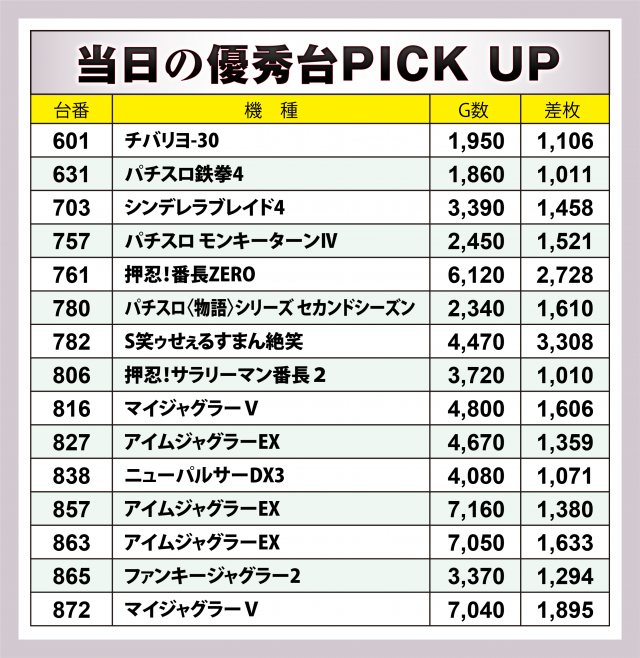 まずは優秀15台のPICK UPから。後述する横並び好況スポット以外で今回のハイスコアとなったのは『S笑ゥせぇるすまん絶笑』『押忍!番長ZERO』。同店では共に3台と比較的少台数設置の機種だが好調となった。また、台数の多いジャグラーシリーズにもプラス台が目立った。