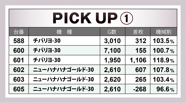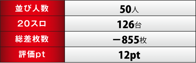 今回、[1,000円/46枚] スロ全126台のトータル差枚数はマイナスで終了。小さな凹みではあるが評価ptが前回から変化しなかったのが残念。その一因にあるのは、優秀15台の表からお分かりの通り5千Gを超えないゲーム数の低い台が目立つことではなかろうか。もっと稼働が伸びていれば最終結果はかなり変わっていたはず。同店の「英雄」取材に挑む勇者たちよ、粘り腰の心意気を持って大いなる結果を導き出して欲しい!