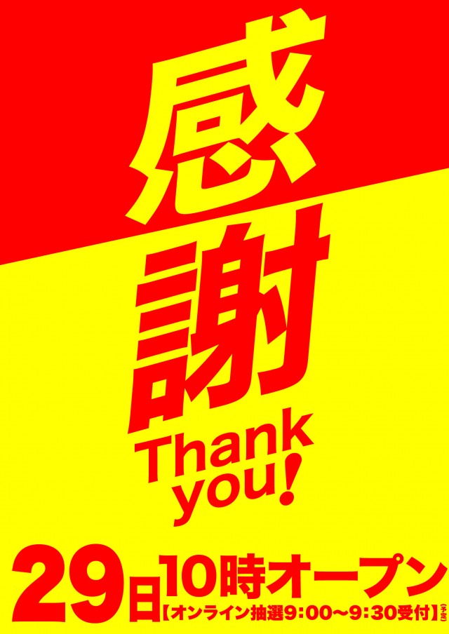 9:00~9:30オンライン抽選受付 9:45入場番号発表 9:50以降再整列 ※整列時にお呼びしてもいらっしゃらなかった場合、一般整列の最後尾のご案内となる場合がございますので、予めご了承下さい。 |