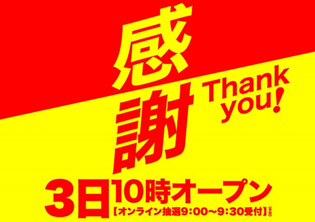 9:00~9:30オンライン抽選受付 9:45入場番号発表 9:50以降再整列 ※整列時にお呼びしてもいらっしゃらなかった場合、一般整列の最後尾のご案内となる場合がございますので、予めご了承下さい。 |