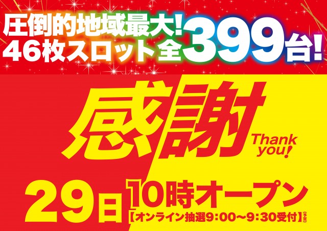 スロット全399台へ増台完了!29日【月】午前10時開店!!