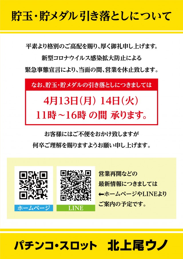 尚、貯玉・貯メダルは営業再開後に使用が可能ですが、