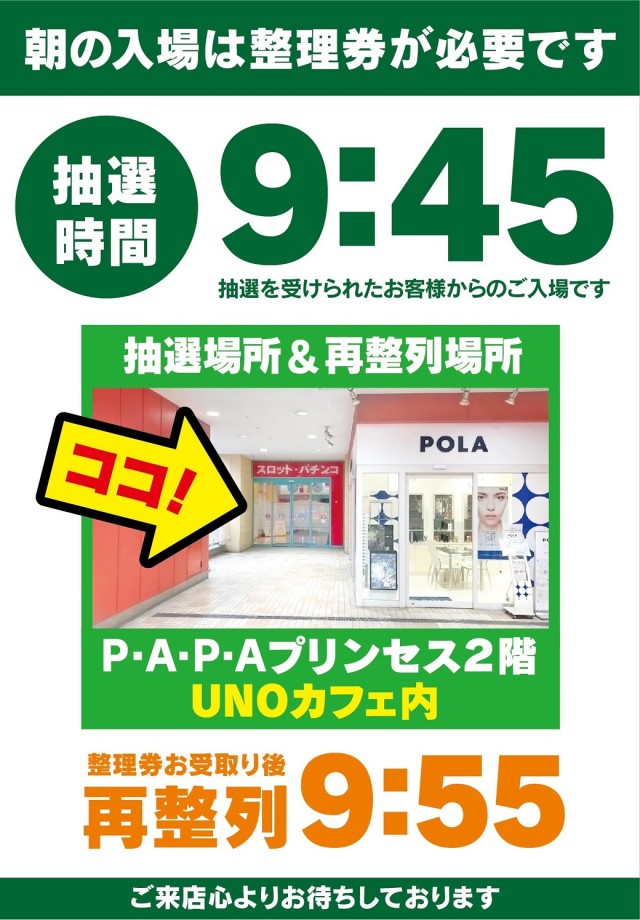 開店時の抽選は 9:45 2Fカフェ入口より。 |