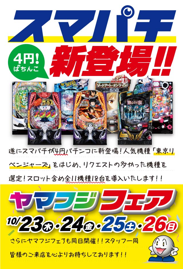 10/24日🌈ヤマフジフェア開催中🌈4円スマパチ新登場!