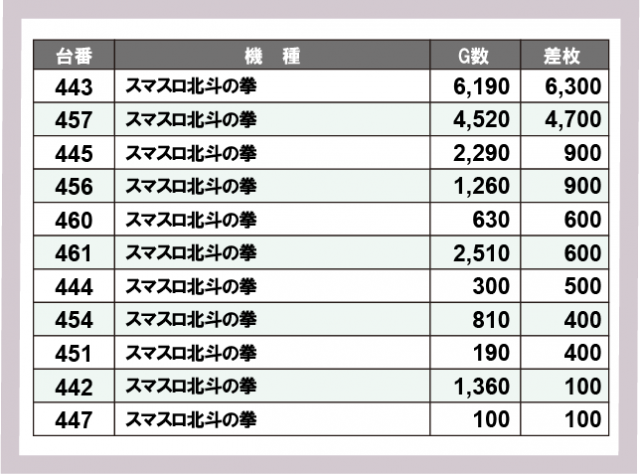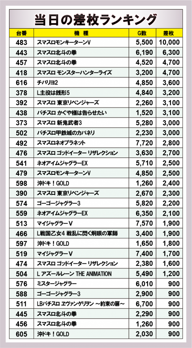 ※差枚数順に掲載しています