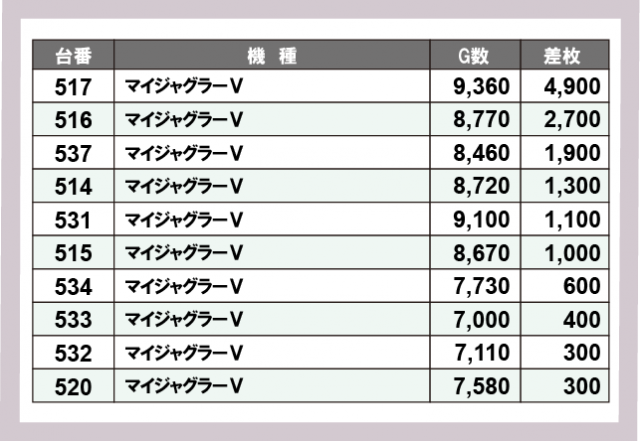 ※差枚数順に掲載しています