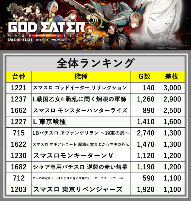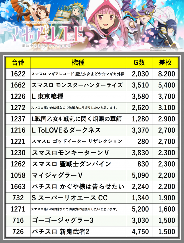 ※差枚数順に掲載しています