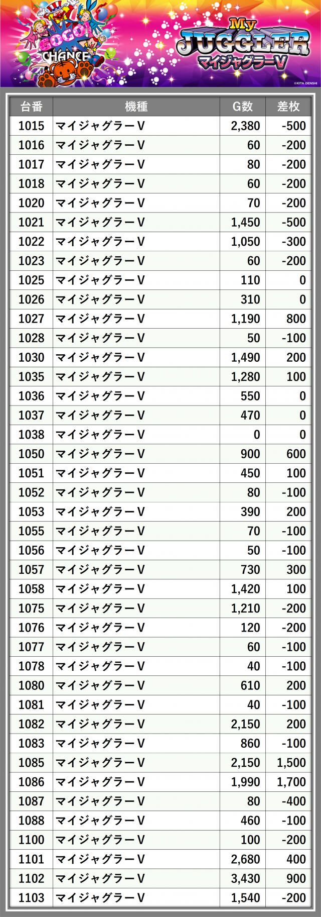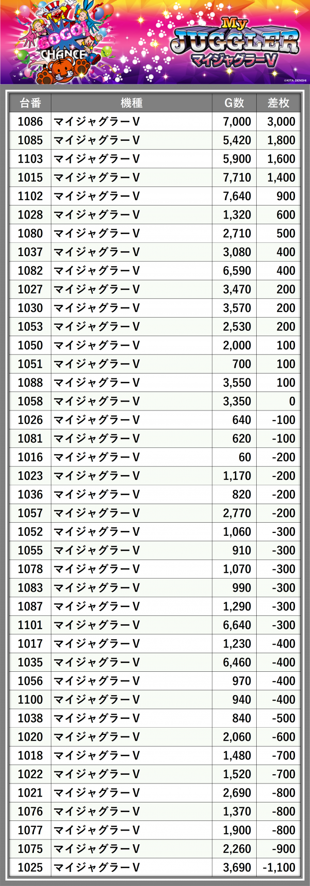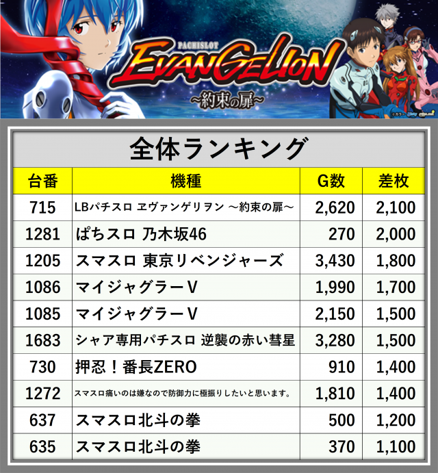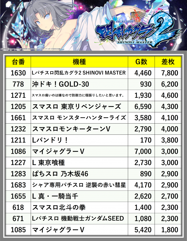 ※差枚数順に掲載しています
