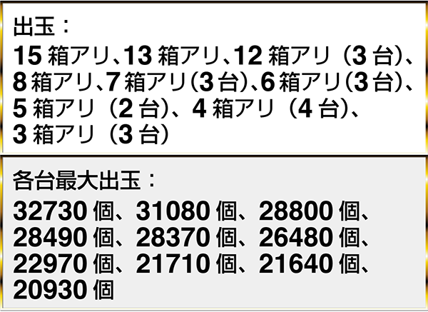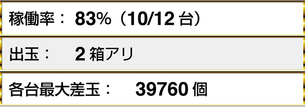 『ぱちんこCR真・北斗無双』では5名以上が10箱を超える出玉を獲得しており、最大で30000個以上を獲得しているデータも2台で確認した。