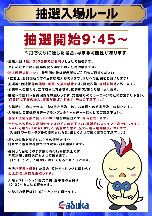 9:45時点でお並び頂いたお客様が抽選対象となります。抽選後はすぐの再整列になりますのでお気を付けください。なお、混雑時は150名様で抽選打ち切りとなりますのでご了承下さい。 |